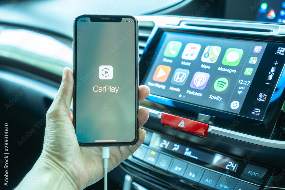 Bangkok Thailand 16 May 2019 Apple Carplay App On Iphone X Smart Mobile Application Connected To Honda Car For Travel Map Hand Free Phone Call Online Music On Transportation Vehicle Safety Stock Photo
